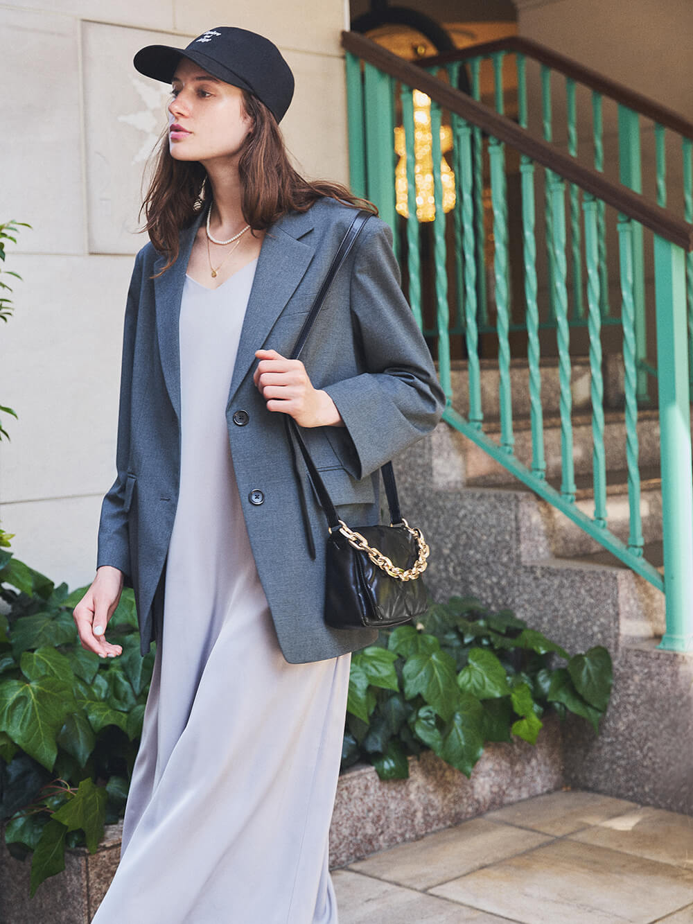 緞面材質吊帶裙襯以西裝外套,打造精緻輪廓。兼具優雅與個性的造型。