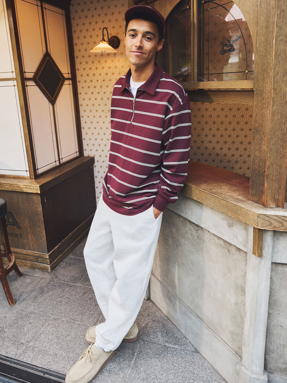 帶有復古條紋的Polo衫,胸前帶有拉鍊的設計再加上寬鬆的版型。