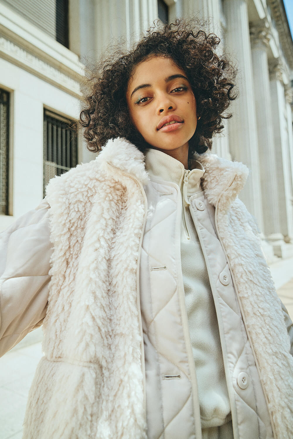 穿出時尚感的關鍵單品是別出心裁的捲刷毛材質拉鍊背心。刷毛套裝穿搭及菱格壓紋外套,襯出既舒適又充滿都會風的造型。全身穿搭均使用米白色調,突顯潮流感。