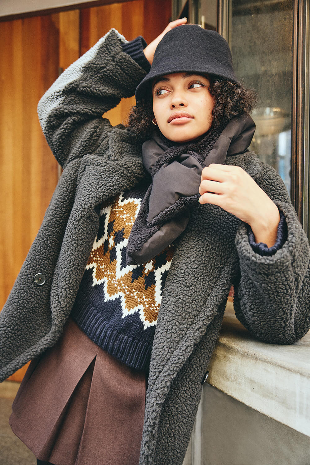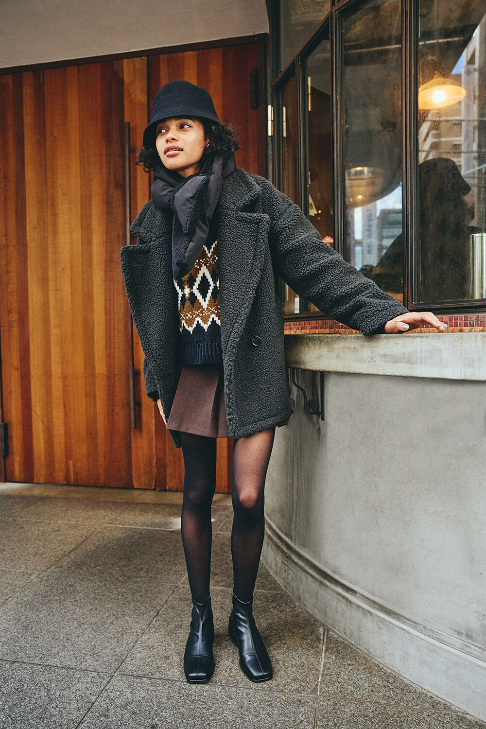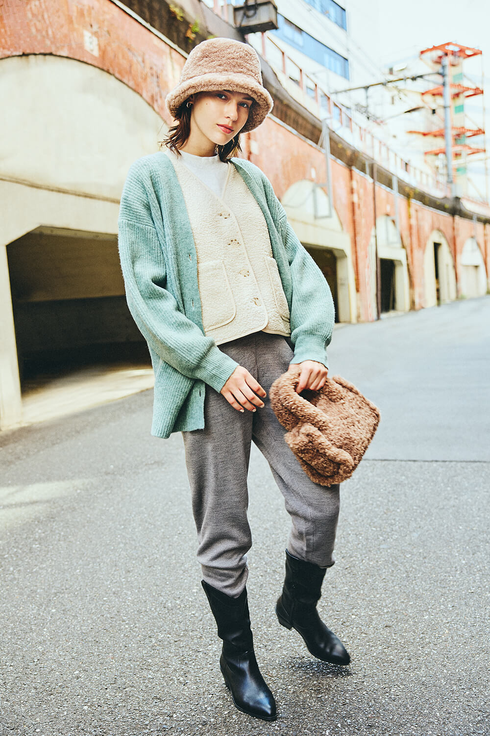 還未需要穿上大衣的時候,最可輕鬆配搭的就是寬版開襟外套。以起毛感紗線製成的材質質感,蓬鬆輕盈又保暖,特色十足。內搭絨毛背心,襯出充滿時尚質感的禦寒造型。