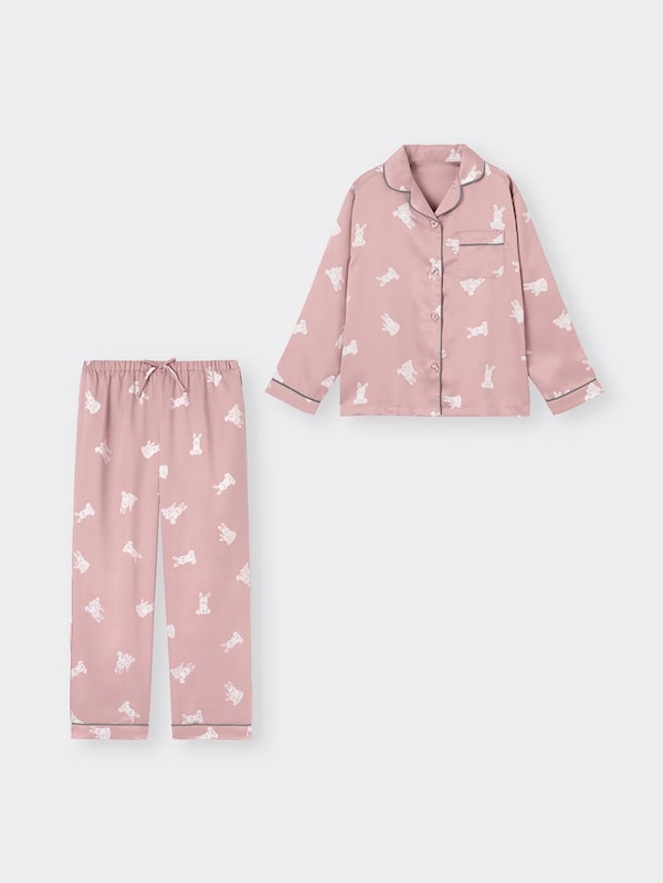 ちょっと背伸びしたような大人っぽいデザインのパジャマ。美しい光沢感となめらかな風合いが魅力のサテン素材を使用し、華やかさをアップしました。抜群の存在感を放つラビットの総柄デザインがおしゃれでかわいいポイント。大人用のパジャマとお揃い柄なので、親子でリンクさせるのもおすすめです。