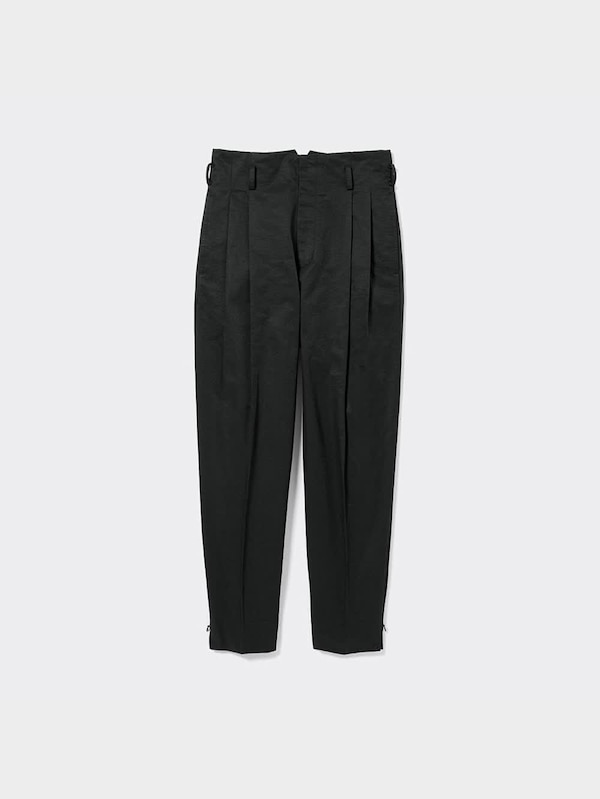 性別問わずはける、男女の股ぐりの違いをカバーしているパターンがポイントの、撥水機能付きテーパードパンツ。深めな2本タックとたっぷりとしたわたりの分量感がポイント。タイトな裾はコンシールファスナー開きで、ワイドなわたりとタイトな裾のコントラストが効いたテーパードシルエットが特徴的なパターン。ウエスト裏はメンズ仕様のマーベルト仕立てで、やや深めな股上でハイウエストでベルトを絞った着こなしも可能。