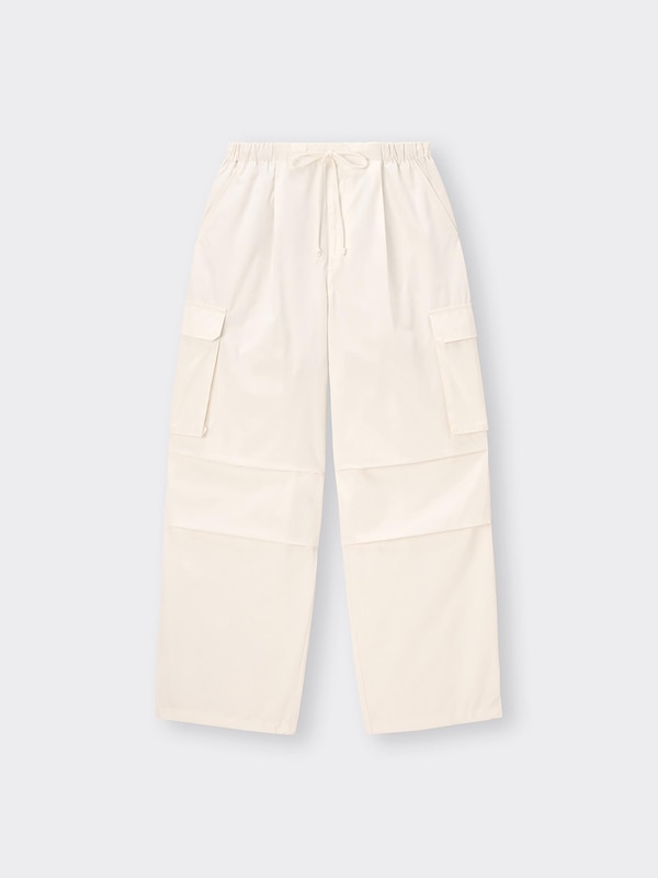 はくだけでスタイリングがサマになるパラシュートカーゴパンツ。ウエストと膝のタック、マチ付きのポケットで立体感を演出しました。ワイドとジョガーシルエットの2つのスタイルができるよう、裾には内ゴムがプラス。ウエストはゴ ムとドローストリング仕様ではきこみ位置も自由自在に調節できます。コンパクトなトップスと合わせるとバランスが良く、スタイルアップ効果抜群です。暑い時期の足元にはサンダルなどで抜け感を出し、寒い時期にはブーツやスニーカーなどと組み合わせてこなれたコーディネートを楽しむのもおすすめ。