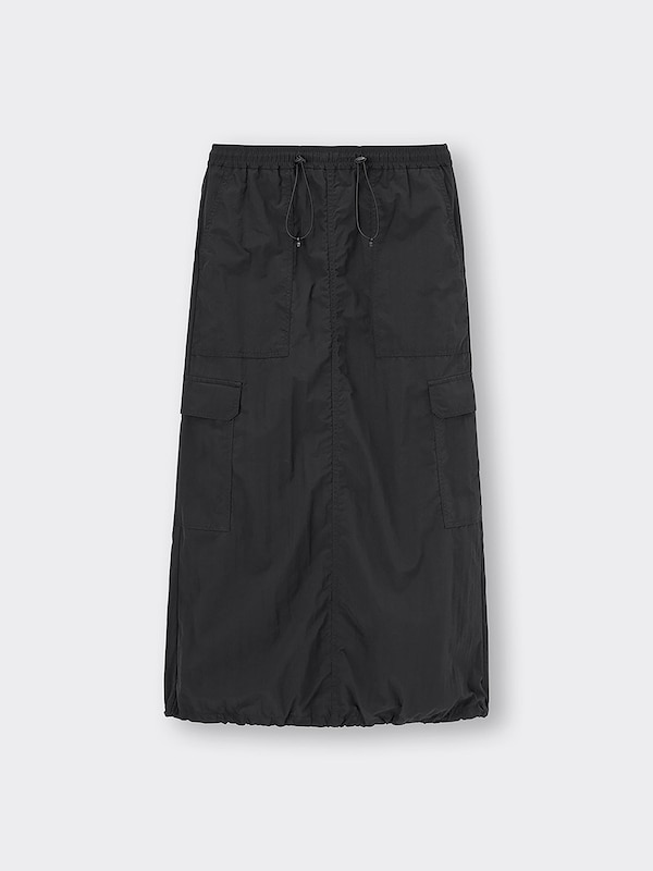 テック素材で登場したロングスカート。ベイカーポケットとカーゴポケットを付けてボリュームを抑えたナローシルエットがポイントです。裾にはストッパー付きのゴムを両側に入れており、脇の一部を絞ることでシルエットの変 化も楽しめます。ウエストのドローストリングがゴムではきこみ位置を変えられるため、フィット感の調節もイージーです。バックスリット入りで脚さばきが良いのも特徴。クロップドトップスと好相性にキマる商品です。
