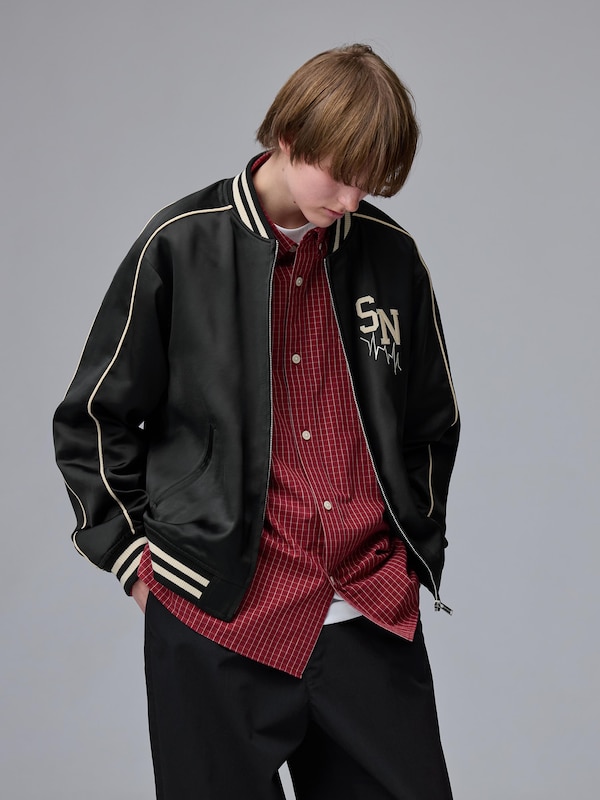 本体:[表地]ポリエステル100%(リサイクルポリエステル繊維を50%使用),[裏地]ポリエステル100%,リブ部分:ポリエステル97%・ポリウレタン3%,パイピング部分:ポリエステル100%,装飾部分:ポリエステル100%,刺繍糸:レーヨン100%
