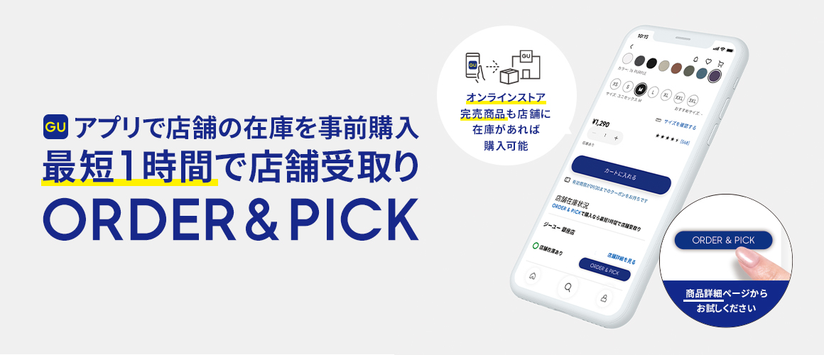 商品詳細ページから、店舗ごとの在庫状況を確認できます。受取る店舗を選び「ORDER & PICK」ボタンをクリックし、注文を完了してください。